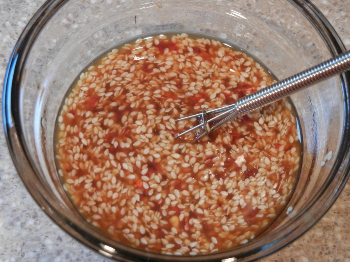 Mix the coconut aminos, water, vinegar, oil, red pepper, and sesame seeds together in a small prep bowl. Whisk to combine well, then set aside. Next, get the chicken cooking (if you don’t have a pre-cooked chicken). You can either boil the chicken in a large sauce pan, or grill it, or pan fry it – anything to cook it all the way through without wasting a lot of time.