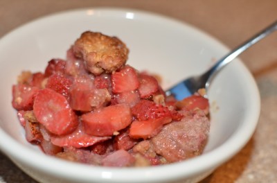 Mix remaining dextrose and the rest of the ingredients in a food processor until mixed into a dough. Form the dough flat and lay on top of the strawberries and rhubarb. Bake for 20 minutes. You should notice some “bubbling” in the bottom of the pan.