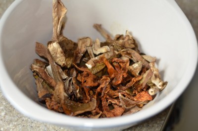Place dried mushrooms in a separate bowl. Boil the beef broth and then pour on top of the mushrooms, letting the mushrooms soak it in then put into Crockpot.