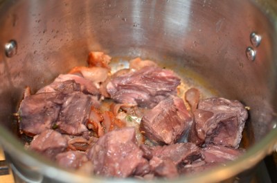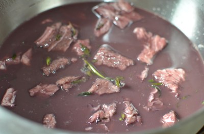 Pour in the wine and toss in the beef. Cover and let marinate for at least four hours.