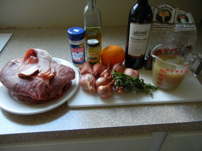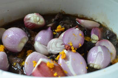 Cook in Crockpot at least four hours on low. About 30 minutes to an hour before it is done, toss in the shallots and grated orange peel. Serve over mashed cauliflower.