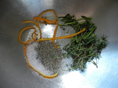 In a large bowl toss in the herb sprigs along with the orange peel, salt, and pepper.