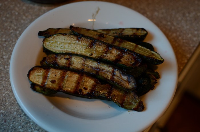 When the timer goes off, you can baste and turn the thighs. Or, if you’ve got good indirect heat going, simply baste them and leave them sitting. It is also time to put the zucchini on the grill. Set the timer for 10 minutes longer and then check when the timer goes off (use a quick-read thermometer to check the meat). Turn the zucchini, baste everything again with sauce, and keep grilling until the zucchini is tender and the chicken reaches 165 degrees inside (maybe 5 to 10 minutes longer).