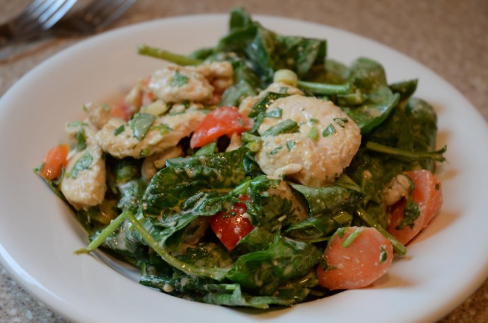This recipe contains a perfect blend of chicken, stir-fried veggies, and salad greens all coated in a creamy cashew dressing. It is easy to make ahead and serve cold – making it perfect for lunch or for a summer potluck. The dressing by itself would be great for dipping coconut-breaded chicken tenders, or as a sauce over grilled asian-spiced pork chops. And feel free to toss in your own variations on the veggies rather than sticking simply to the carrots and red bell peppers we used. I know this would go great with the addition of mushrooms, snow peas, or just about anything else you can think of.