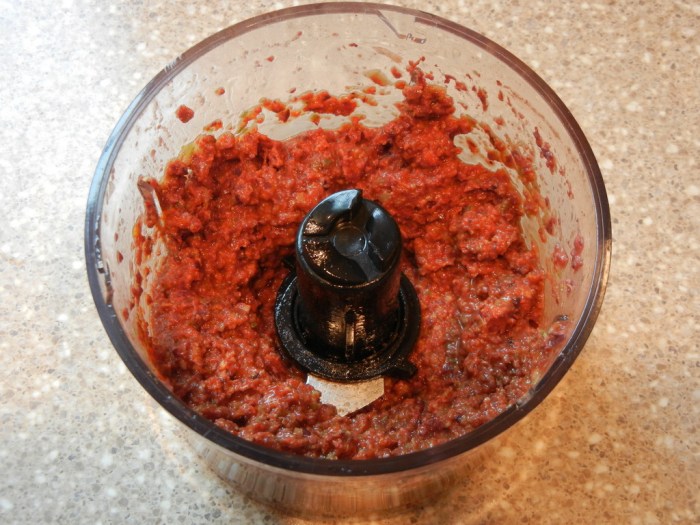 Combine everything in the bowl of a small food processor or blender. It may help to cut the garlic cloves into smaller pieces before throwing in, and to slice the sun-dried tomatoes into 1/4-inch wide pieces as well – just to keep things roughly the same size when you start.