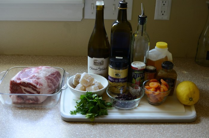 Following the marinating time, transfer the roast to a 13×9 pan. Heat the oven to 400 degrees – convection if you have it. Pour the liquid from the marinade into the pan, then spoon the chunks of raisin and apricot over top of the roast. Dot the butter over the top, and pour the wine over top as well (being careful not to wash the solids and butter off the top). Poke a meat thermometer into the end of the roast so it is reading the middle – or use a meat probe if you have one for your oven.