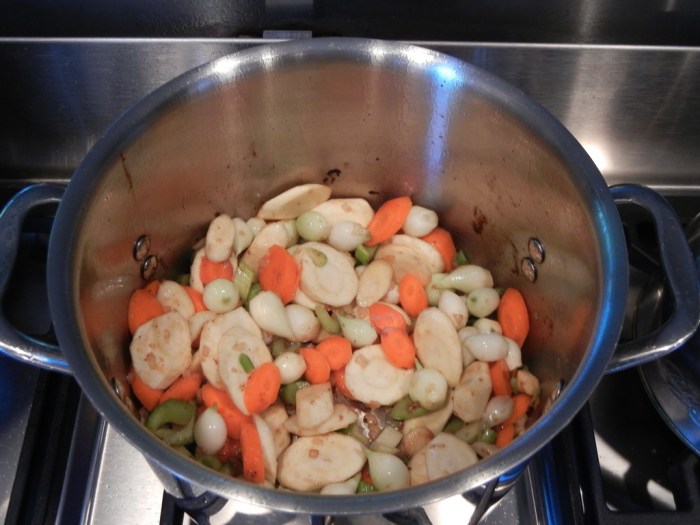 I started out by smoking the ribs on the grill for 30 minutes at 170 degrees to add some more depth to their flavor. This is purely optional, but I would certainly give it a try. After that, take an oven-proof stock pot (with a lid) or dutch oven – large enough to eventually hold all of the ribs – and melt 2 tablespoons of butter in it over medium-high heat. Sear the ribs, working in batches and adding a little more butter if needed, until all the sides have been browned. Move to a plate when each batch is done. While this is happening, you can also get your other ingredients chopped and prepped.