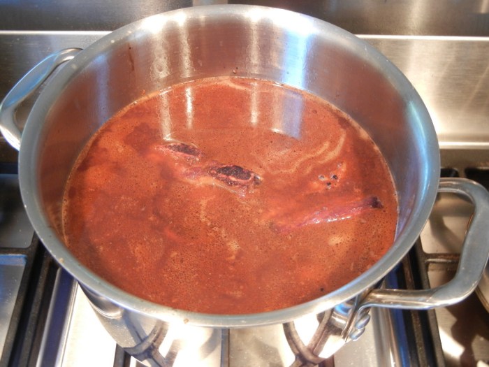 Preheat the oven to 350 degrees. Deglaze the stock pot with the wine for a minute or two, then add the cocoa and chile powder. Boil for about 4 to 5 minutes to reduce the liquid roughly to half, then remove from the heat. Place the ribs in the stock pot and add beef stock to cover (you can use a little water if needed, if the quart of stock isn’t quite enough). Place in the oven, covered, for 2 hours. After 2 hours, stir the veggies into the pot and place back in the oven, covered, for an additional 30 minutes.