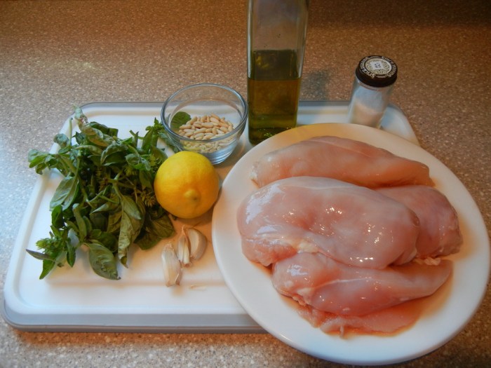 Use a sharp paring or fillet knife to cut a horizontal slit into each breast. Insert the knife into the side near one end and cut toward the other end, leaving about half an inch uncut on three sides. Pack this “pocket” with roughly a tablespoon of pesto in each breast.
