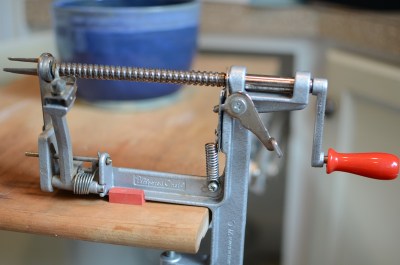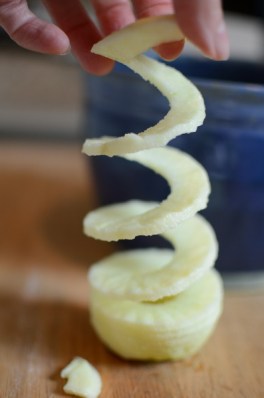 In the meantime start peeling and coring some apples. I use the Pampered Chef brand apple corer/peeler which works great! It cores, peels, and slices all with a few turns of the handle. It will form your apple into a spiral making it very easy to just cut them into smaller chunks. As the spiraled peel comes off the apple as you turn, it is a good idea to put your garbage can or compost pail under the peeler so that it will catch the peel.