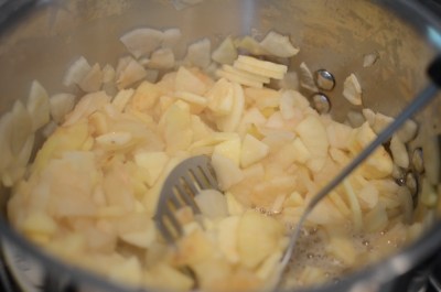 Put about a 3/4 cup or so of water into your stockpot and add the pieces of apple. Turn on a med-low heat. As the apples warm up, begin to stir and mash them. Don’t get the water too hot as you don’t want the apples to burn. Keep mashing and adding until you get the desired amount and the consistency of sauce that you would like (chunky or more smooth is up to you). Then, spoon the applesauce into the jar. Using a plastic knife, run it down the inside of the jar, getting rid of any air bubbles.