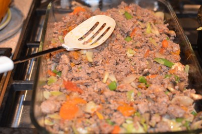 Heat oven to 350 degrees. Just a quick note that I mainly cook on convection. If you do not have convection then your cooking time may vary slightly from mine. Put the sweet potatoes in a pot of water and turn on high to get them boiling until they are fairly soft. In the meantime, get all veggies chopped. In one pan melt 1 tablespoon of coconut oil and cook the ground beef and turkey. In another pan, melt 1 tablespoon of coconut oil and toss in the garlic, onions, carrots, peas, mushrooms, cabbage as they are chopped. Then add in the spices and stir them in.