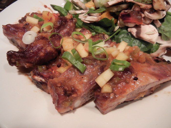 Slice the ribs into riblets, then sprinkle with the reserved chopped peaches and scallions. Serve with some of the reserved peach sauce, and dig in.