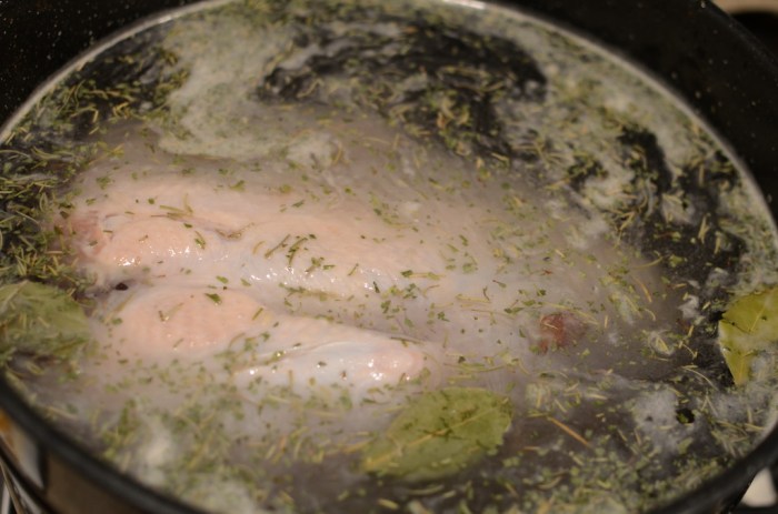 Start with one quart of water in a pot on the stove. Heat to near boiling, then add all of the brine ingredients. Stir until the salt is fully dissolved, then remove from heat. Grab a canning pot or food safe container large enough to hold the entire bird AND fit in the refrigerator (there are alternative methods using a cooler and ice if you don’t have the fridge space), then add the brine “tea” to this container. Pour in four quarts of ice-cold water to bring the temperature down below 50 degrees. Place the bird, breast down, into the brine and add enough water to fully cover the bird. Place in the refrigerator for 6 to 12 hours.