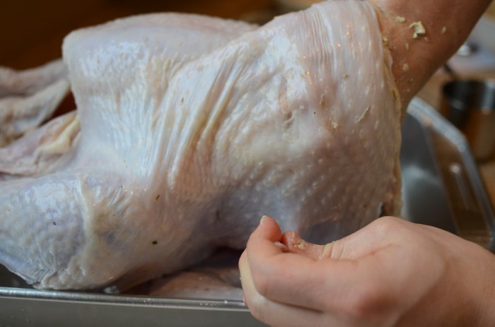 Remove the turkey from the brine (discard the liquid), then rinse completely inside and out in cold water. Pat dry, then place in a roasting pan breast up. Using your fingers, work carefully to loosen the skin of the bird away from the meat along the breasts, back, thighs, and legs – trying not to tear the skin at all (you’d be amazed how flexible the skin is after brining all night). Combine all of the rub ingredients in a small food processor and pulse until they form a thick paste, then rub liberally all over under the skin of the bird. Make sure to leave plenty of excess around the breast, and rub a little on the inside of the cavity as well.