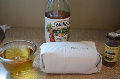 Put roast in crockpot. Mix juice, vinegar, and spice then pour on top of the roast. Cook on high for at least 4 hours or until pork is cooked thoroughly. There are many options to this recipe. Garlic can be added, same with some veggies such as onions and celery. Other spice options would also be great. Make it your own! Sorry for my lack of pictures. I have kids and get distracted. Need I say more? Dig in!