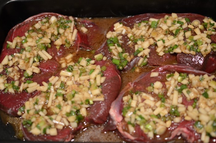 This marinade recipe has a distinctively Asian influence, and was incredible with the elk sirloin steaks we had when my parents came to visit for Christmas. Served with our Pomegranate, Apple, and Walnut Salad from the other day, it was a great meal for the days leading up to our Christmas feast.