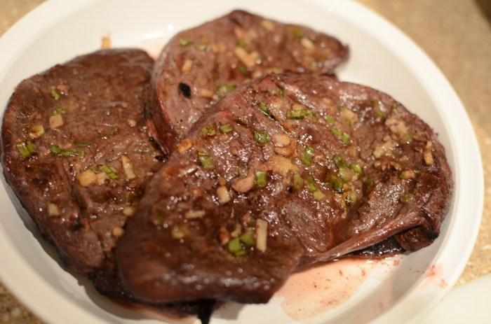 Cook as usual for steaks – about 8 minutes per side on my pellet grill for a perfect medium rare (less if you have direct heat gas or charcoal). Remove and let them rest for another few minutes before slicing thin across the grain and serving. If you like, you can julienne the left over pear into matchsticks and serve with the sliced steak, as well as sprinkle a pinch of sesame seeds on top.