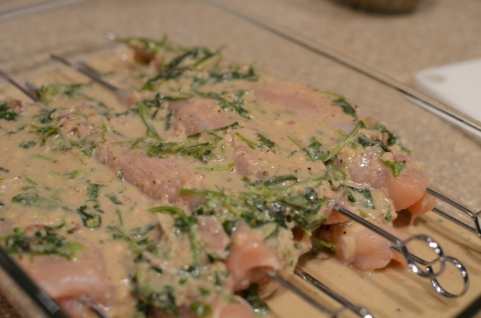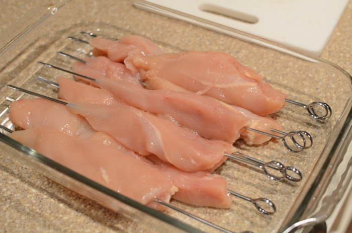 Slice the chicken breasts lengthwise to make 8 pieces roughly 1-1/2″ wide by 3/4″ thick. Thread them onto metal skewers and arrage half of them in a single layer in a 13×9 glass baking dish.