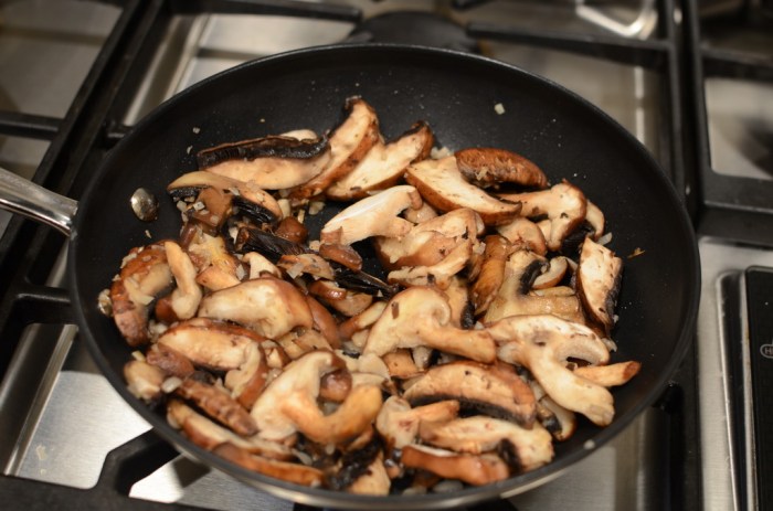 Add in the mushrooms. Add additional oil and butter, in equal amounts, to keep from sticking and cook the mushrooms for 5~10 minutes until they have softened and cooked down in volume.