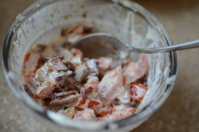 Use about 1/3 cup or so of the mayo and mix in the dill. Next mix the bacon and tomatoes with the mixture.