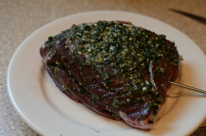 Using a sharp knife, make shallow slits all over the surface of the roast – about 1/2″ deep and 1-1/2″ long. Rub the mint garlic mixture all over the roast, working it into the slits and all over the exterior. Insert a meat thermometer or probe so that it will read the center, thickest part of the meat.