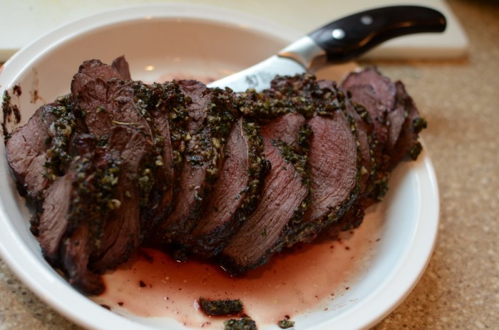 Preheat the oven or grill to 350 degrees (indirect heat for the grill). Make sure your roast is fully thawed, and let sit on the counter (covered) for about 30 minutes prior to starting to get it closer to room temperature (this helps both with cooking time and with keeping the whole roast closer in “doneness” throughout). In a small food processor or blender, combine all of the ingredients (except the roast of coarse!). Pulse until everything is minced fine, but not reduced to a paste.