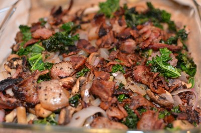I found it easiest to just use three pans here to cook everything at the same time. Cook the burger in one pan with half the coconut oil, the bacon in another, and then the rest of the oil, mushrooms, shallot, kale in another.
