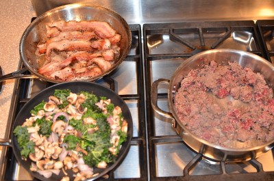 - I found it easiest to just use three pans here to cook everything at the same time. Cook the burger in one pan with half the coconut oil, the bacon in another, and then the rest of the oil, mushrooms, shallot, kale in another.