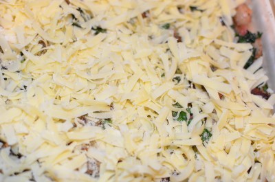 Once burger is cooked thoroughly, crumble into the bottom of a 8×8 pan or pie pan. Chop up the bacon and mix into the veggie mixture. Put this mixture on top of the burger mixture.