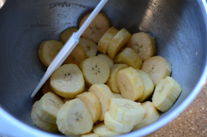 - Slice the plantains across into pieces about 1/2″ thick and place in a large mixing bowl.