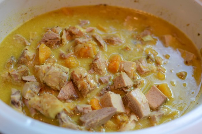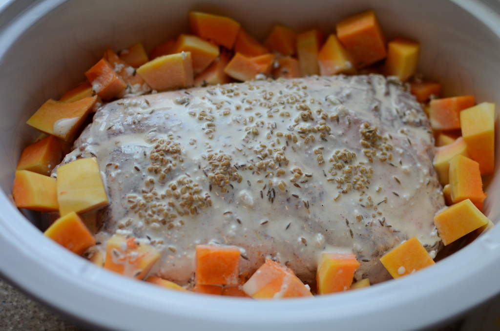 Place the roast in the center of a large slow cooker crock. Add the bay leaves around the bottom, and the cinnamon stick. Next, place the squash around the roast. Combine one can of the coconut milk with the turmeric, cumin, fenugreek, garam masala, and salt in a small mixing bowl. Whisk to fully combine, then pour over the roast.