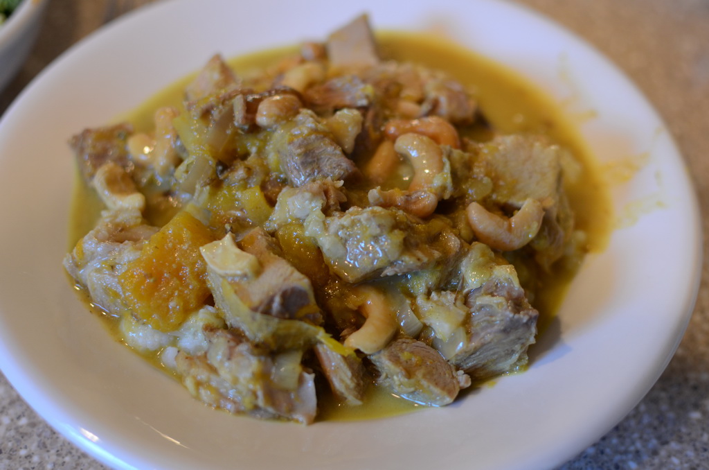 Just before serving, stir in the remaining half can of coconut milk and the cashews. You can also fish out the bay leaves and cinnamon stick at this time. Add a couple of dashes of lemon juice to taste. Serve in a shallow bowl over a bed of the riced cauliflower. We also had a garden salad of greens from our CSA on the side. Enjoy!