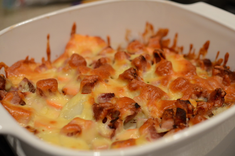 - In a large baking dish, layer by adding in half of the milk mixture, some potatoes and onion/mushroom mixture, ham, and a bit of the cheese. Layer again and finish with the cheese.