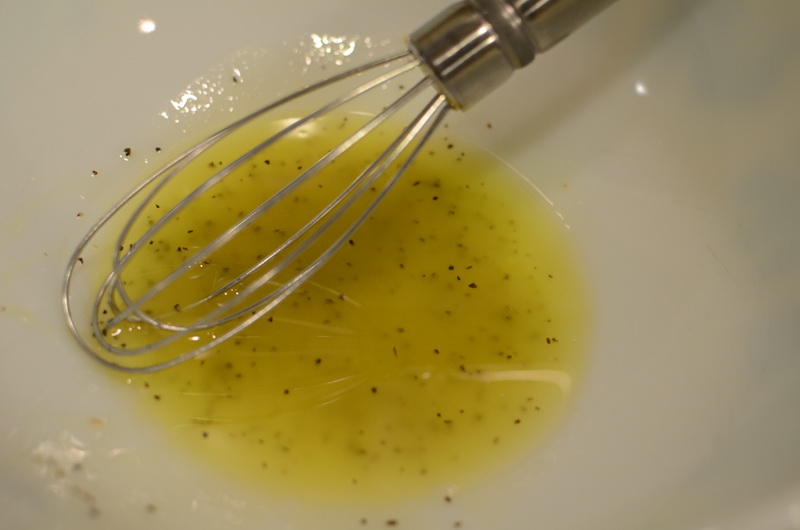 - Whisk the olive oil and vinegar together with the pepper and salt in a medium bowl.