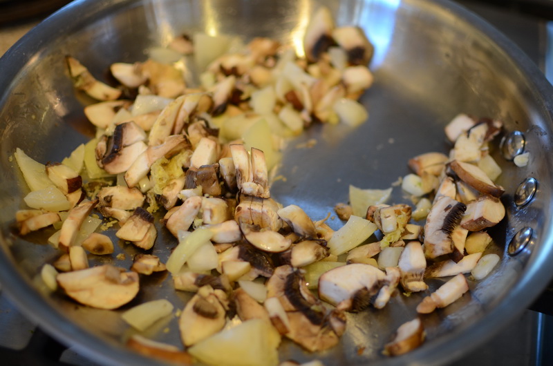 Melt the ghee in a pan on low heat, add in ginger, garlic, onions, and mushrooms. Saute’ for a minute or two and then add broccolini.