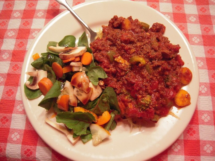 Spaghetti (Squash) with Sauce Author: Purely Primal Prep time: 5 mins Cook time: 25 mins Total time: 30 mins Serves: 6 Ingredients 1 spaghetti squash 1-1/2 lbs grass-fed free-range ground beef 1 can (15 oz) tomato sauce 1 can (15 oz) diced or stewed tomatoes 1 can (6 oz) tomato paste 2 cloves garlic, minced … Continue reading Spaghetti (Squash) with Sauce