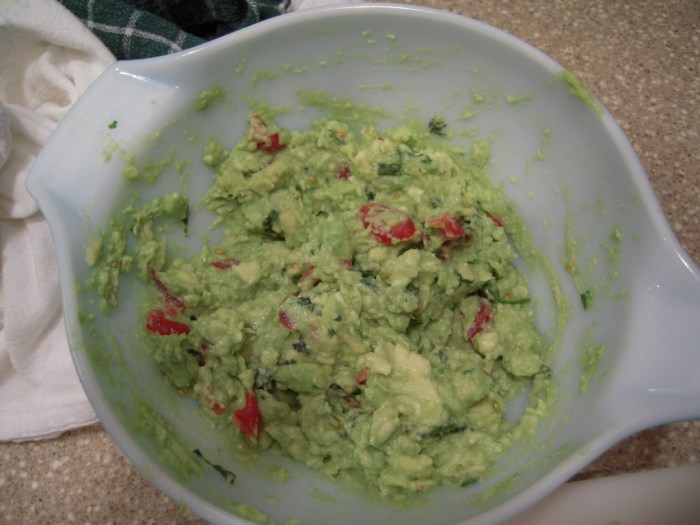 Guacamole Recipe Type: Side Dishes Author: Purely Primal Prep time: 10 mins Total time: 10 mins Serves: 6~8 Ingredients 2 ripe avocados 2 tablespoons of chopped cilantro Juice of one lime 1 clove of garlic, minced 5 grape tomatoes, chopped (or 1 roma tomato, chopped) pinch or two of salt Instructions Cut the avocados in … Continue reading Guacamole